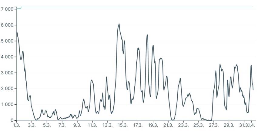 tuulivoiman tuotanto oli noin 35 tuntia alle 200 MW tason. 200 MW ei ole