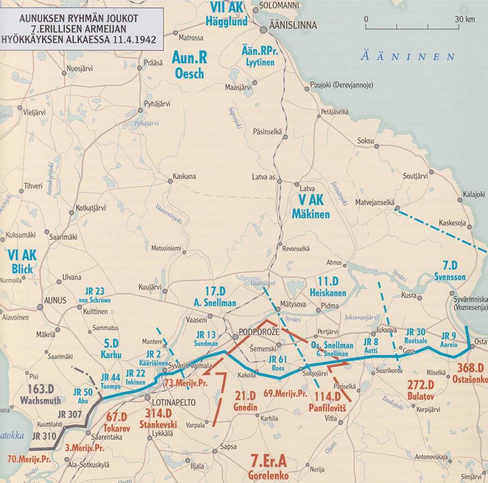 Syvärin pohjoispuolelta hyökkäyksen jatkamista varten. Suomalaisjoukot olivat