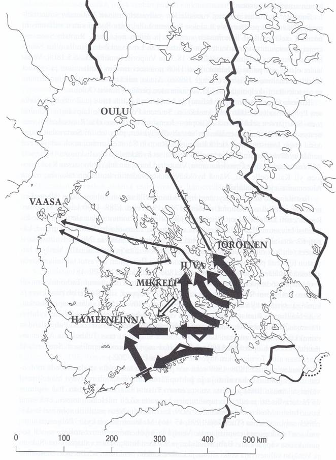 Helsinkiä ja jälkimmäinen leveällä rintamalla Salpausselkää pitkin kohti