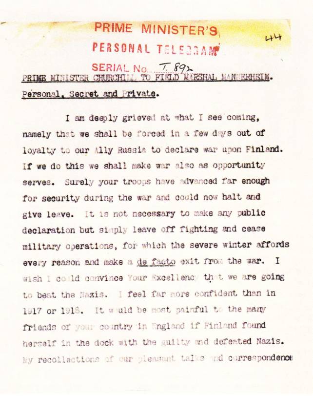 pääministeri Winston Churchill lähetti marsalkka Mannerheimille henkilökohtaisen,