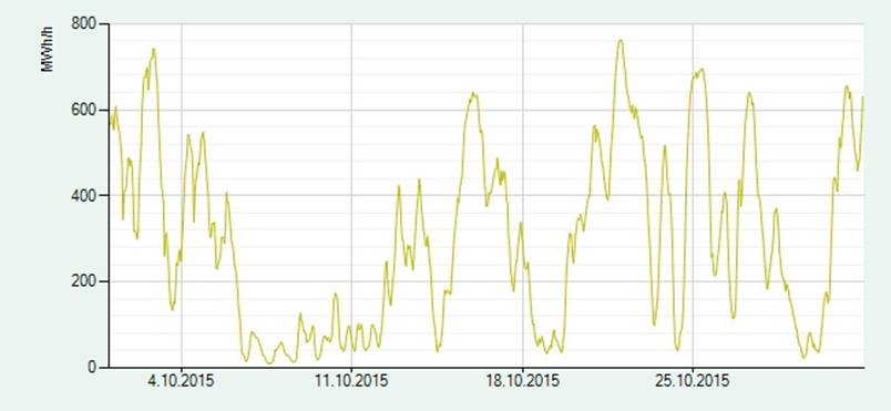 1.10.-31.10.2015. Minimi 9MW, maksimi 763MW.