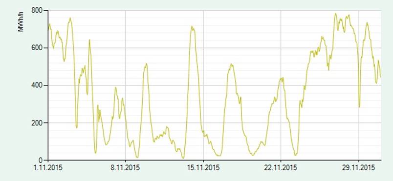 1.11.-30.11.2015. Minimi 11MW, maksimi 785MW.