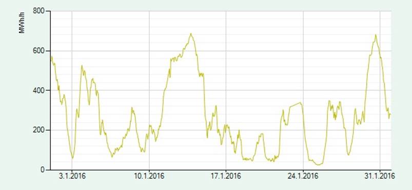 1.01.-31.01.2016. Minimi 26MW, maksimi 688MW.