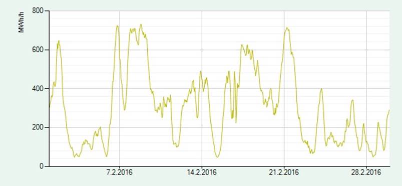 1.02.-29.02.2016. Minimi 47MW, maksimi 731MW.