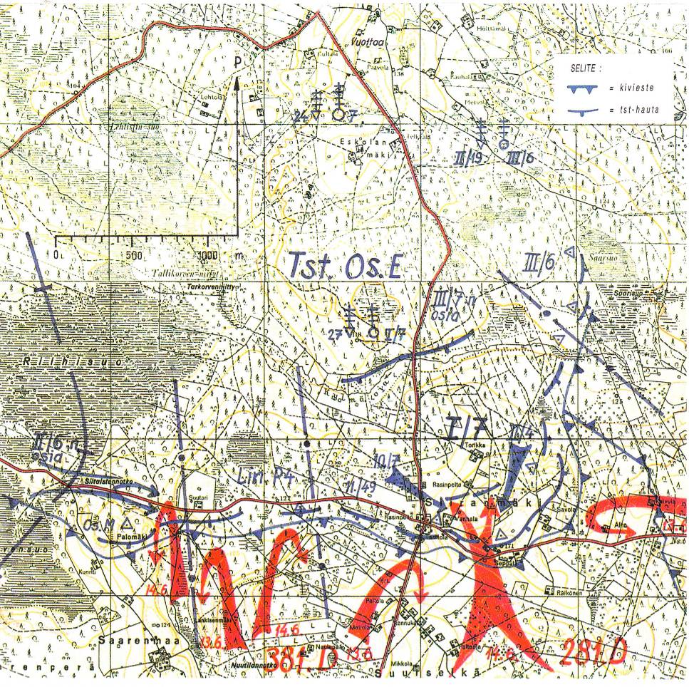 taisteluhautaa Siiranmäen laelle. 2.D tykistö ampui 14.6. noin 8 820
