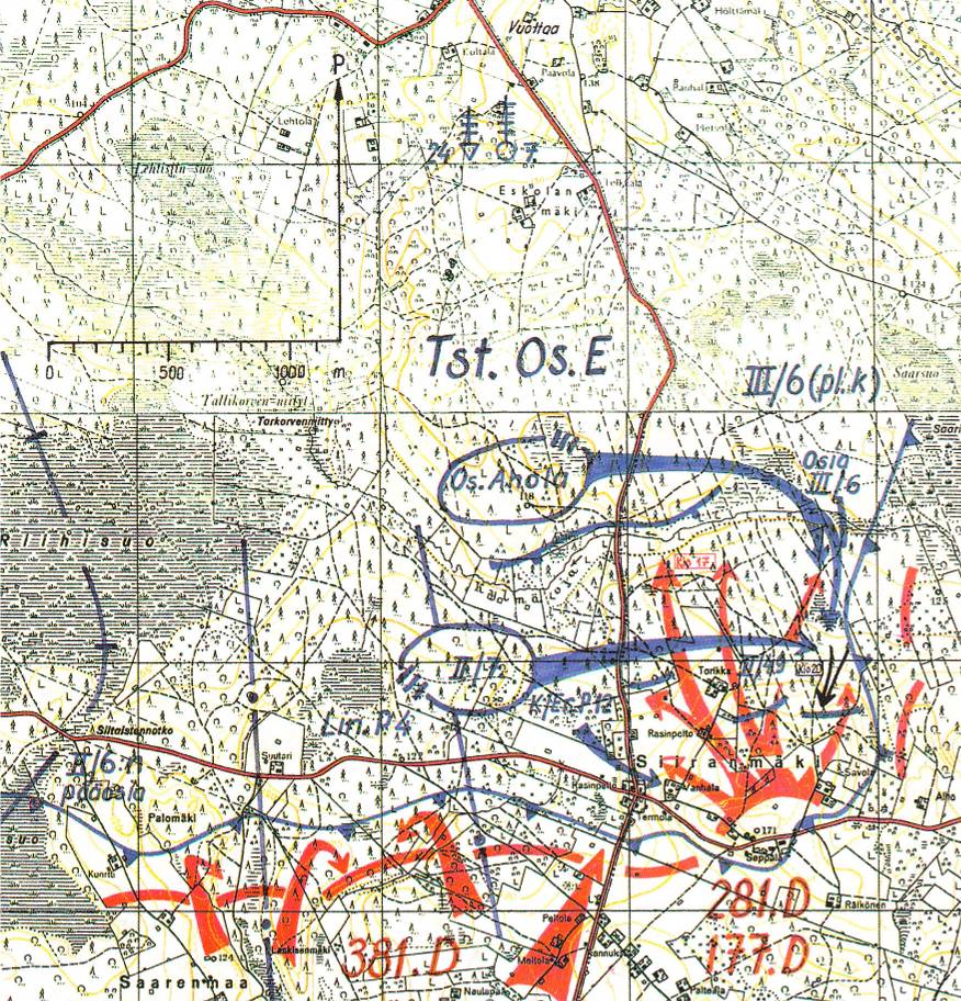 pyrkien vyöryttämään suomalaisten asemia. Vihollisen hyökkäyskiila